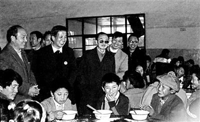 1990年孔繁森在浙江省绍兴市看望藏族班师生。资料图片