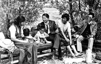 孔繁森在拉萨河畔与青年教师一家亲切交谈。资料图片